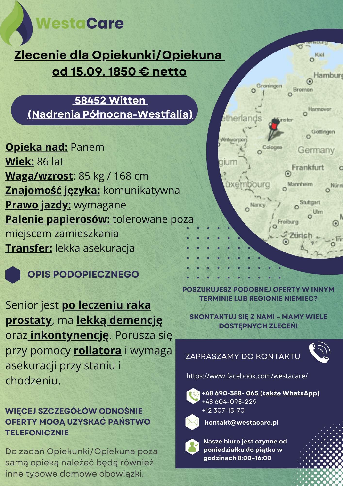 Zlecenie dla Opiekunki/Opiekuna od 15.09. 1850 € netto