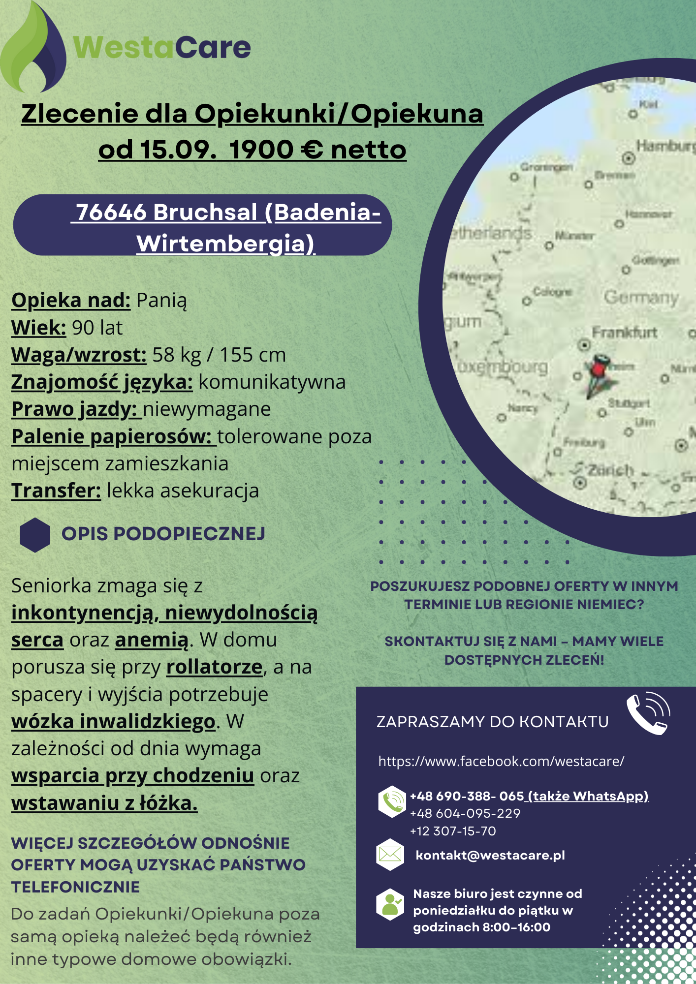Zlecenie dla Opiekunki/Opiekuna od 15.09. 1900 € netto