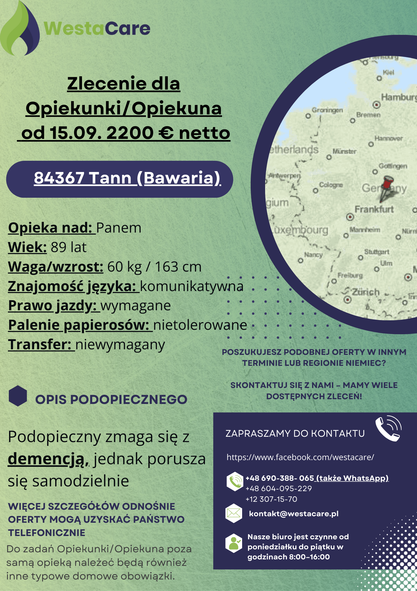 Zlecenie dla Opiekunki/Opiekuna od 15.09. 2200 € netto