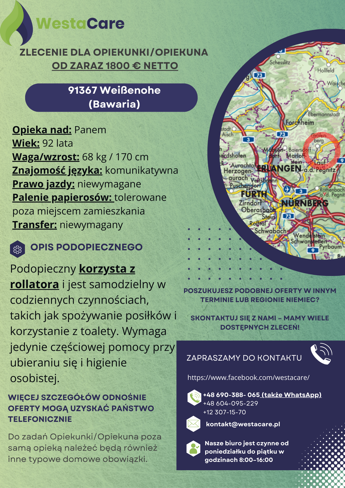 Zlecenie dla Opiekunki/Opiekuna od 10.09. 1800 € netto