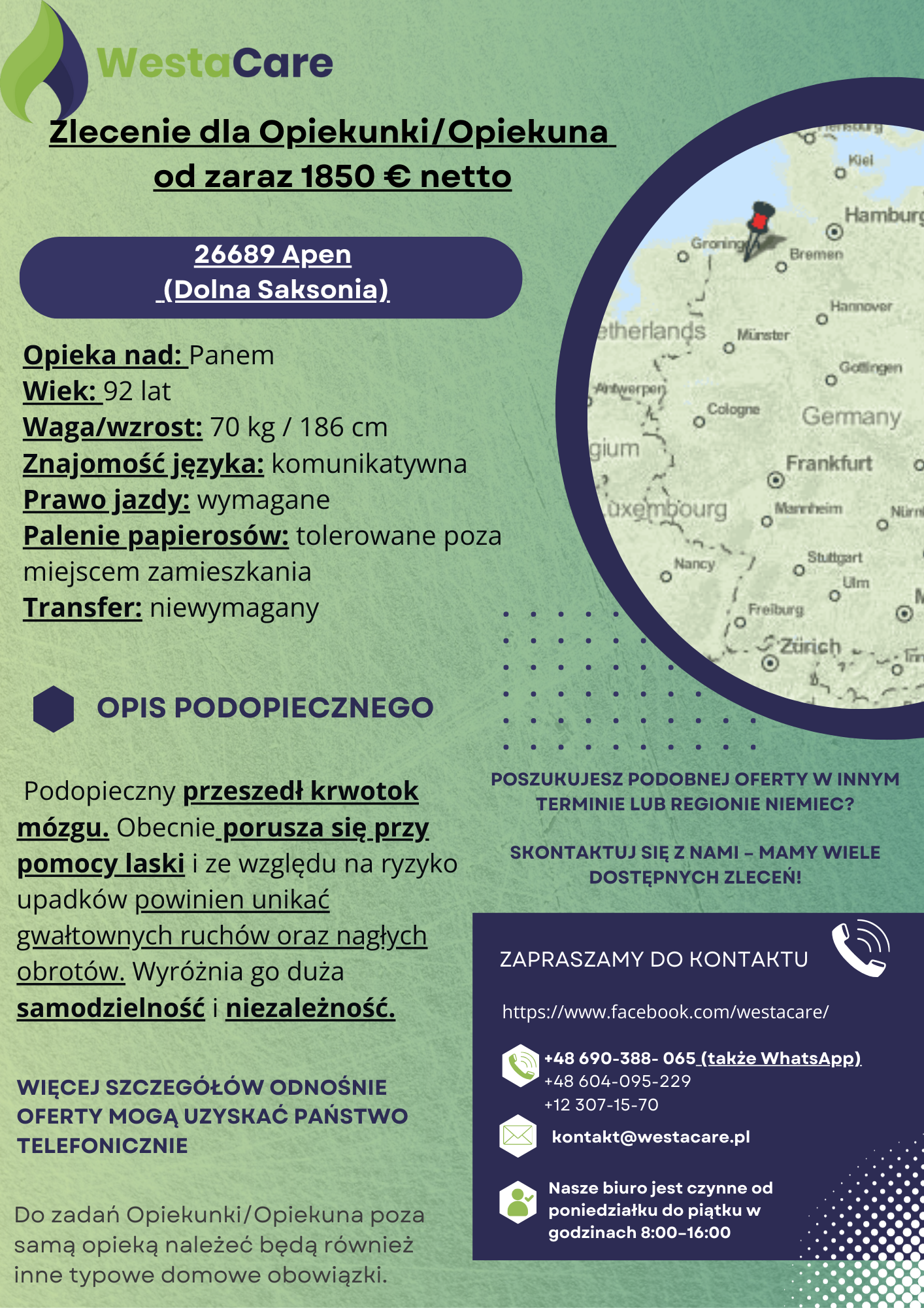 Zlecenie dla Opiekunki/Opiekuna od zaraz 1850 € netto