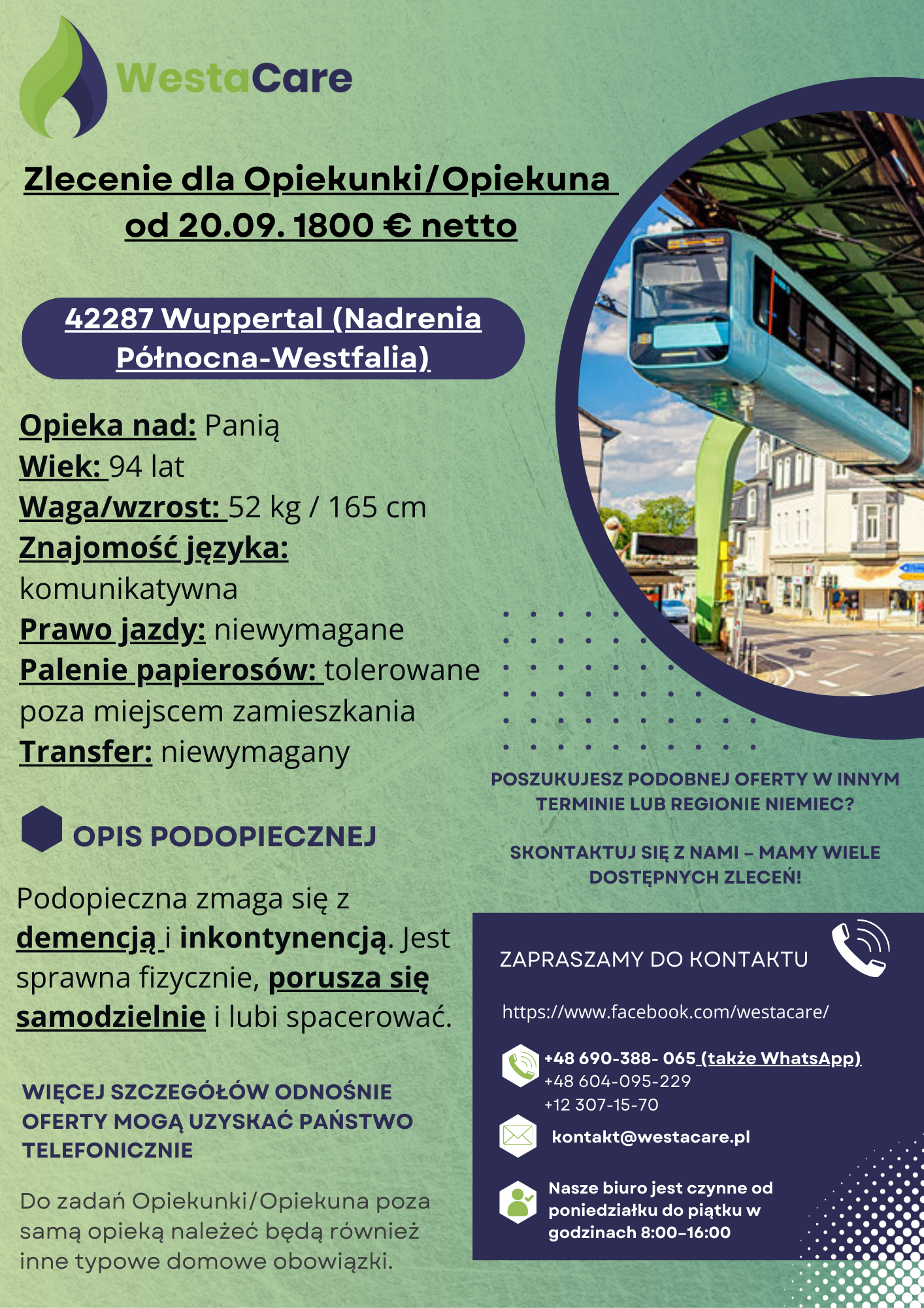 Seniorka mieszka sama w domu o powierzchni 150 m² w 42287 Wuppertal – malowniczym, zielonym mieście w Nadrenii Północnej-Westfalii, znanym z unikalnej kolejki podwieszanej „Schwebebahn”, licznych parków, przyjaznej infrastruktury i bogatej oferty kulturalnej oraz handlowej. Dla Opiekuna/Opiekunki przygotowano w pełni wyposażony pokój z dostępem do internetu.