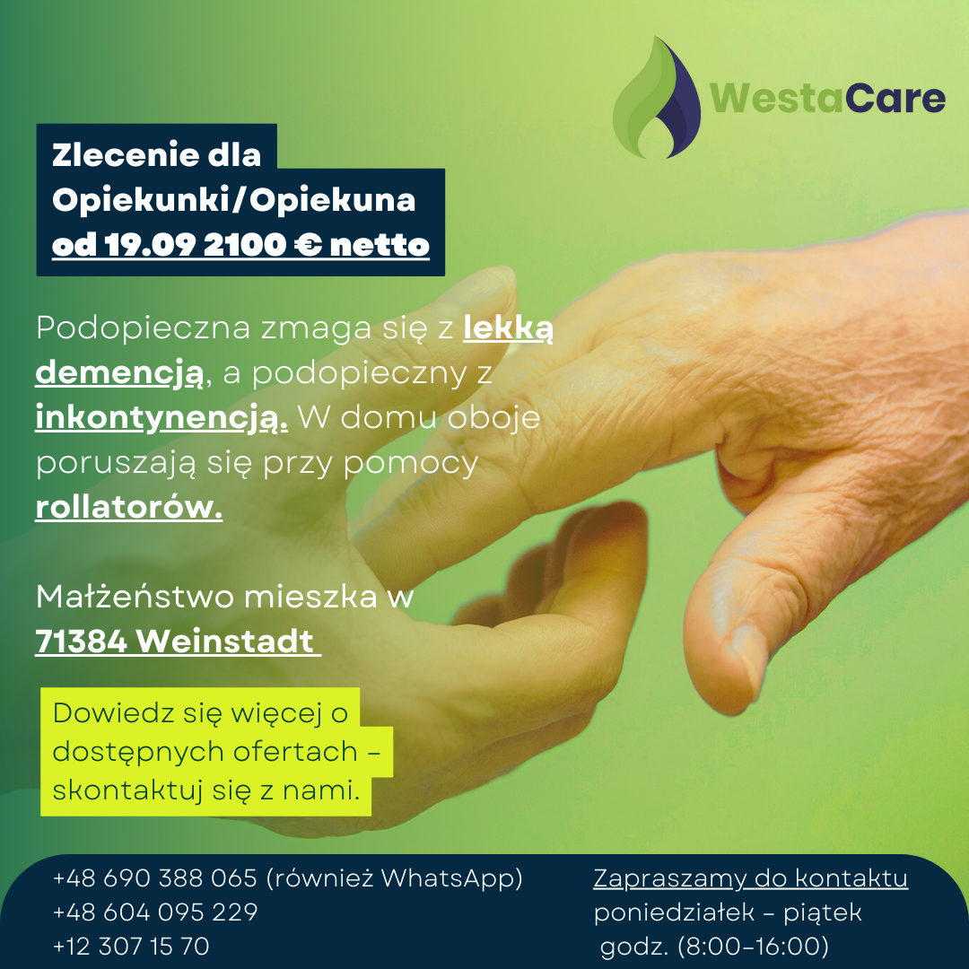 Zlecenie dla Opiekunki/Opiekuna od 19.09 2100 € netto