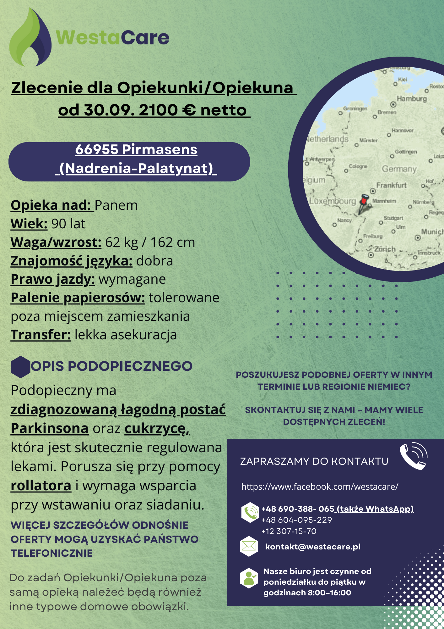 Zlecenie dla Opiekunki/Opiekuna od 30.09. 2100 € netto