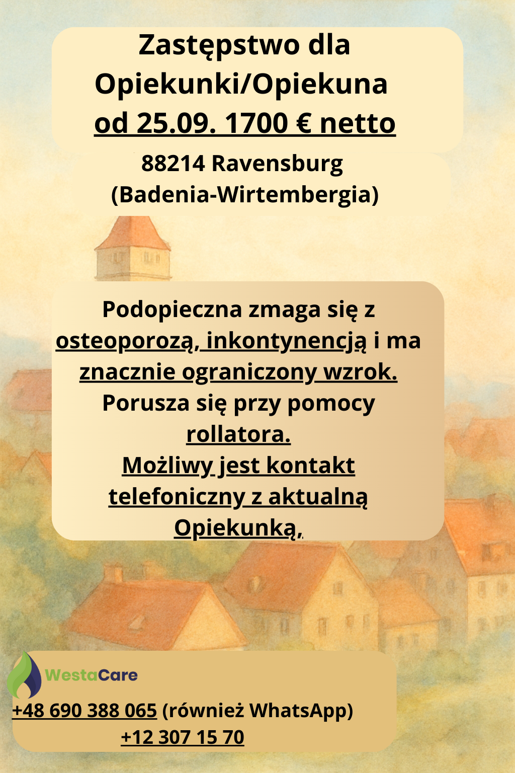 Zastępstwo dla Opiekunki/Opiekuna od 25.09. 1700 € netto
