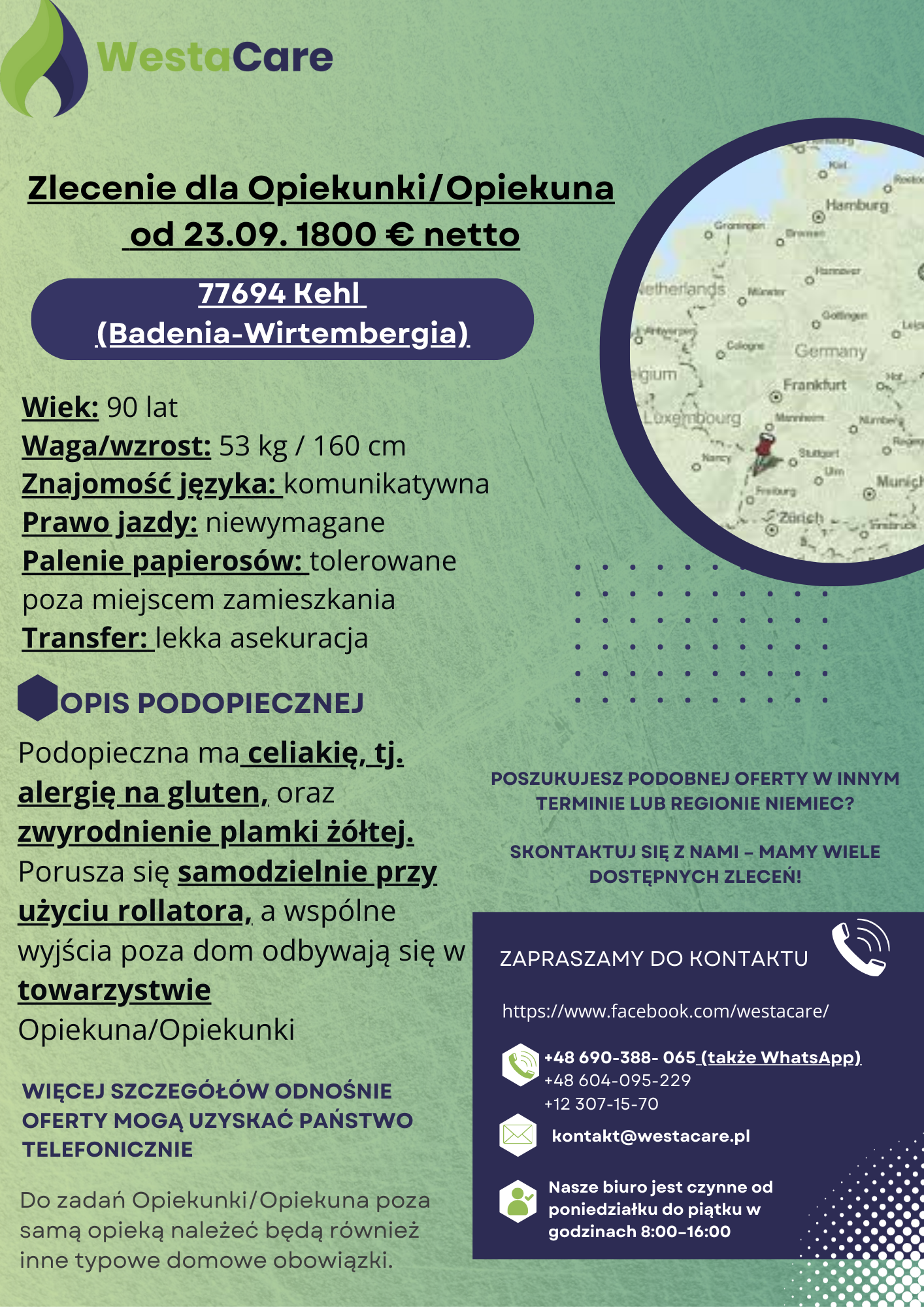 Zlecenie dla Opiekunki/Opiekuna od 23.09. 1800 € netto