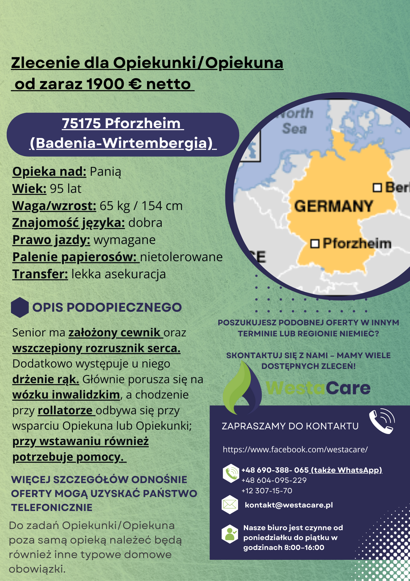 Zlecenie dla Opiekunki/Opiekuna od zaraz 1900 € netto