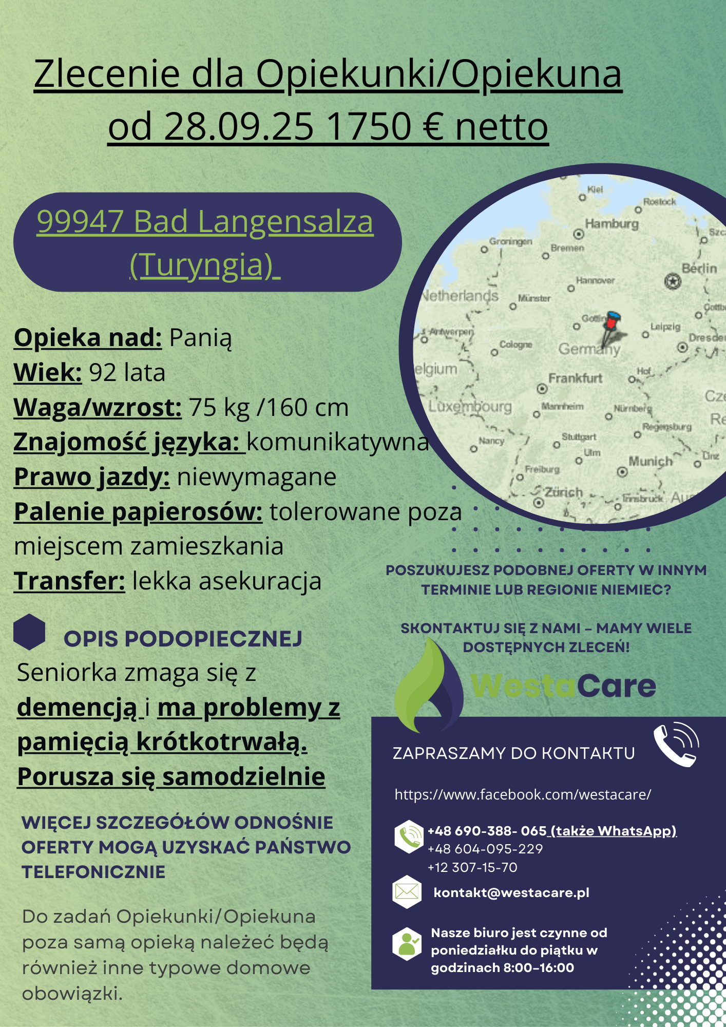 Zlecenie dla Opiekunki/Opiekuna od 28.09.25 1750 € netto