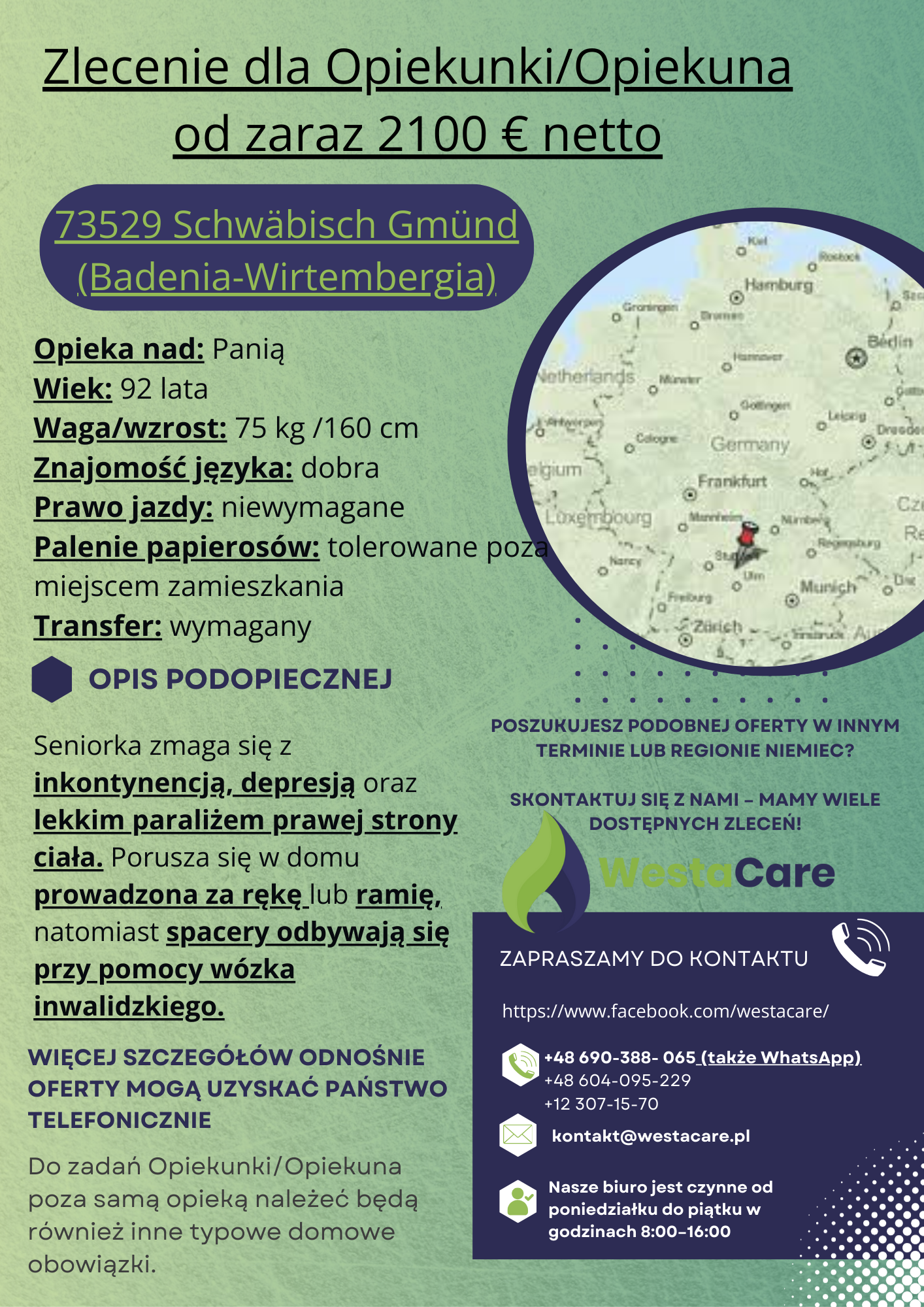 Zlecenie dla Opiekunki/Opiekuna od zaraz 2100 € netto