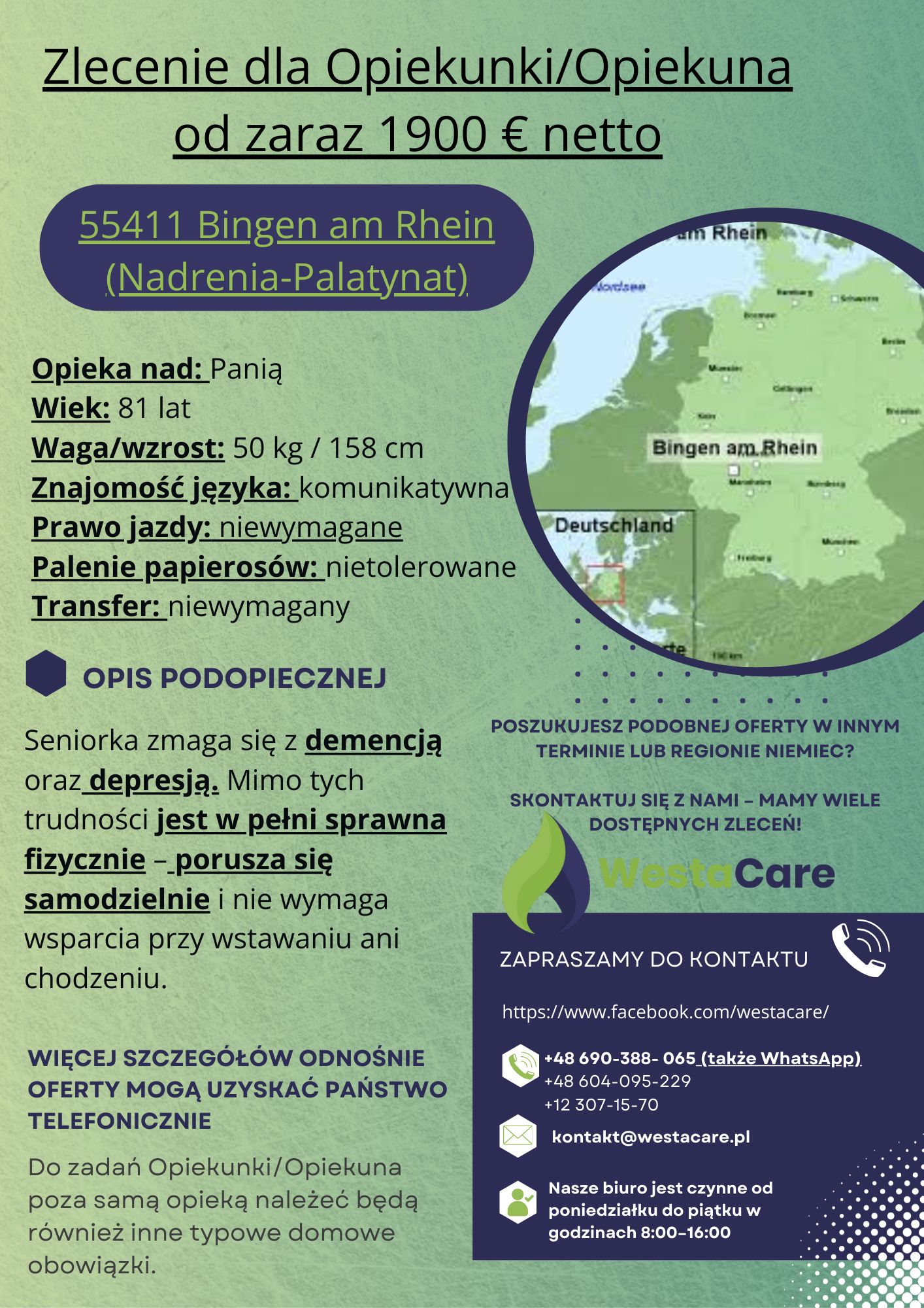 Zlecenie dla Opiekunki/Opiekuna od zaraz 1900 € netto