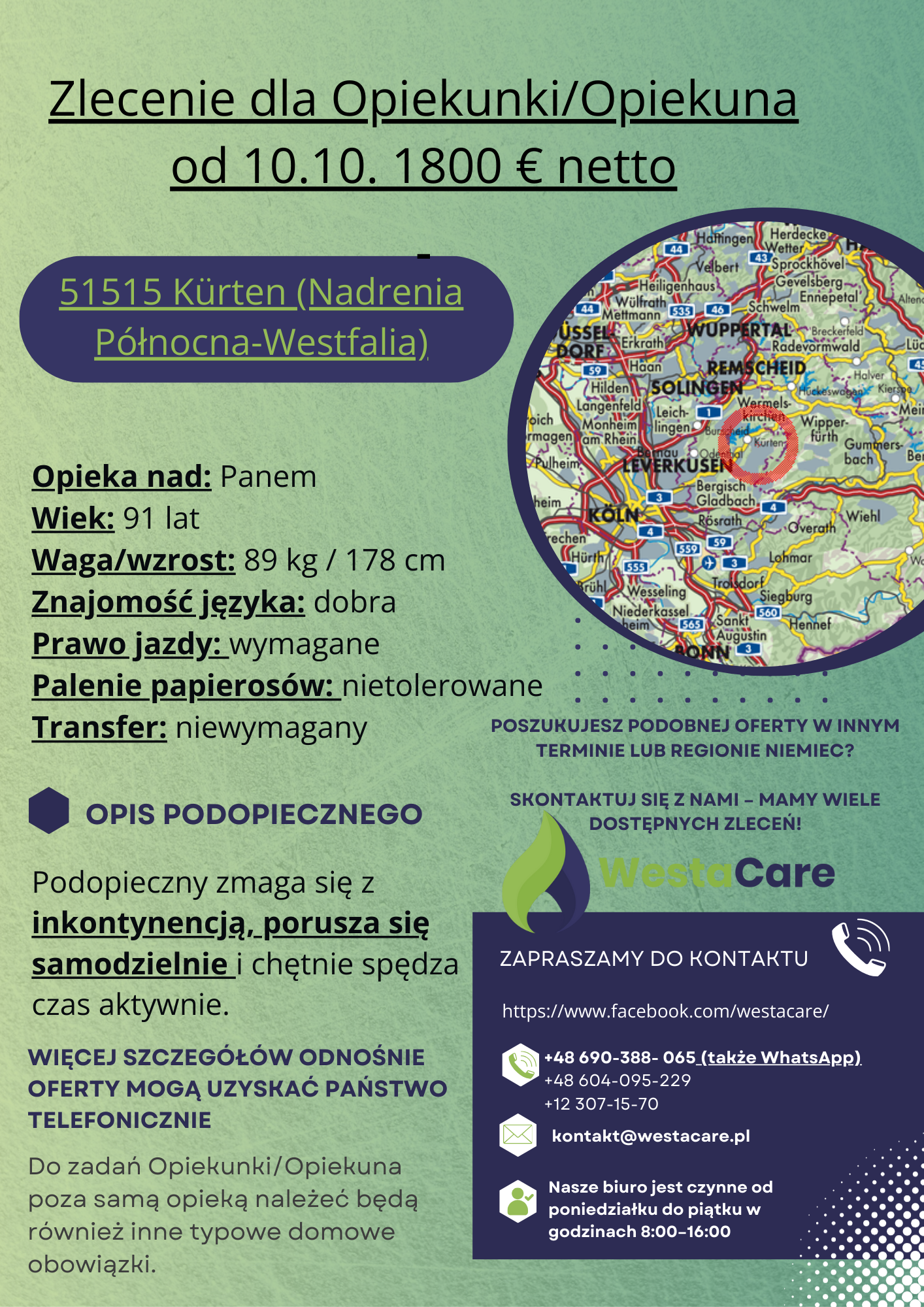 Zlecenie dla Opiekunki/Opiekuna od 10.10. 1800 € netto
