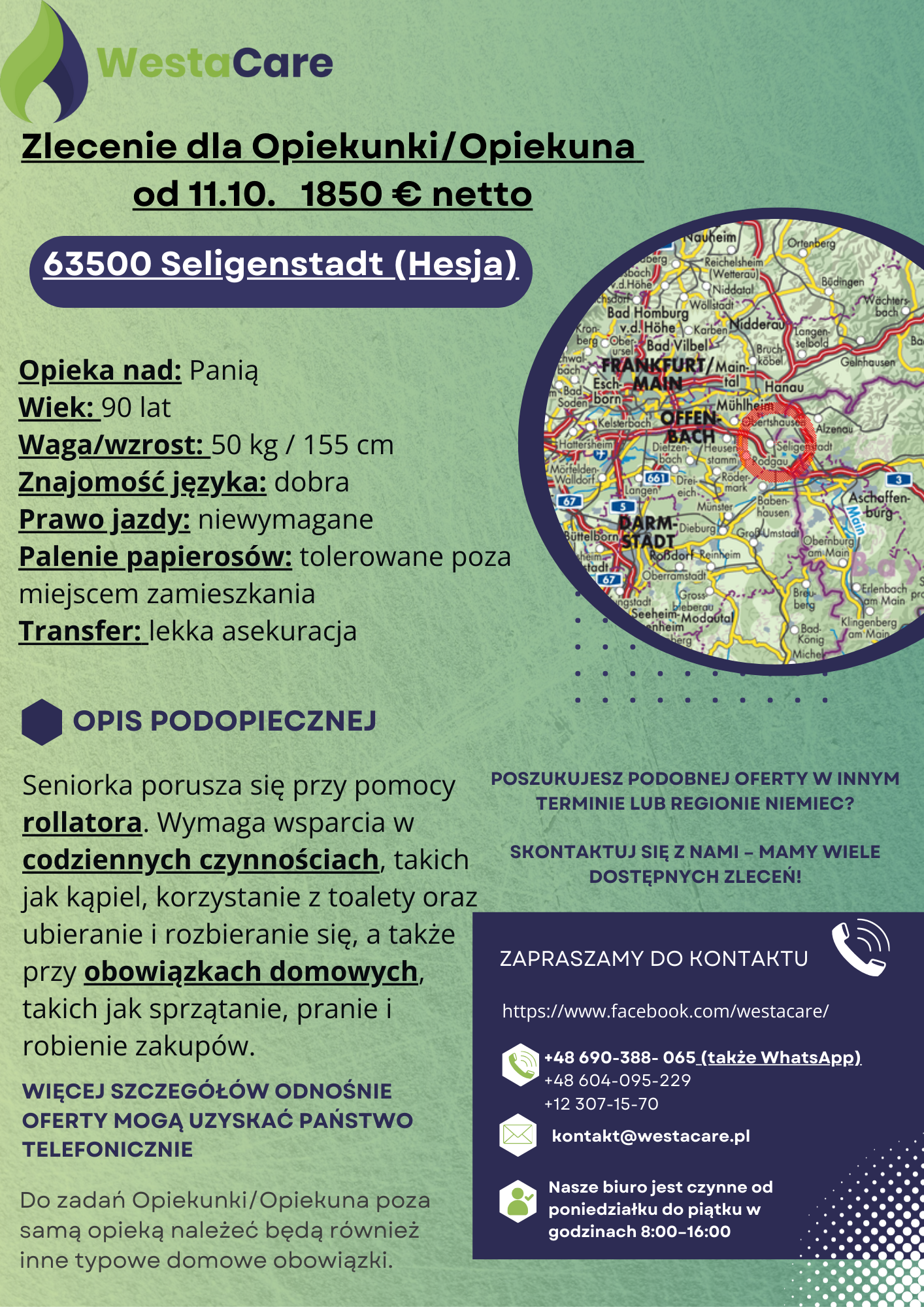 Zlecenie dla Opiekunki/Opiekuna od 11.10. 1850 € netto