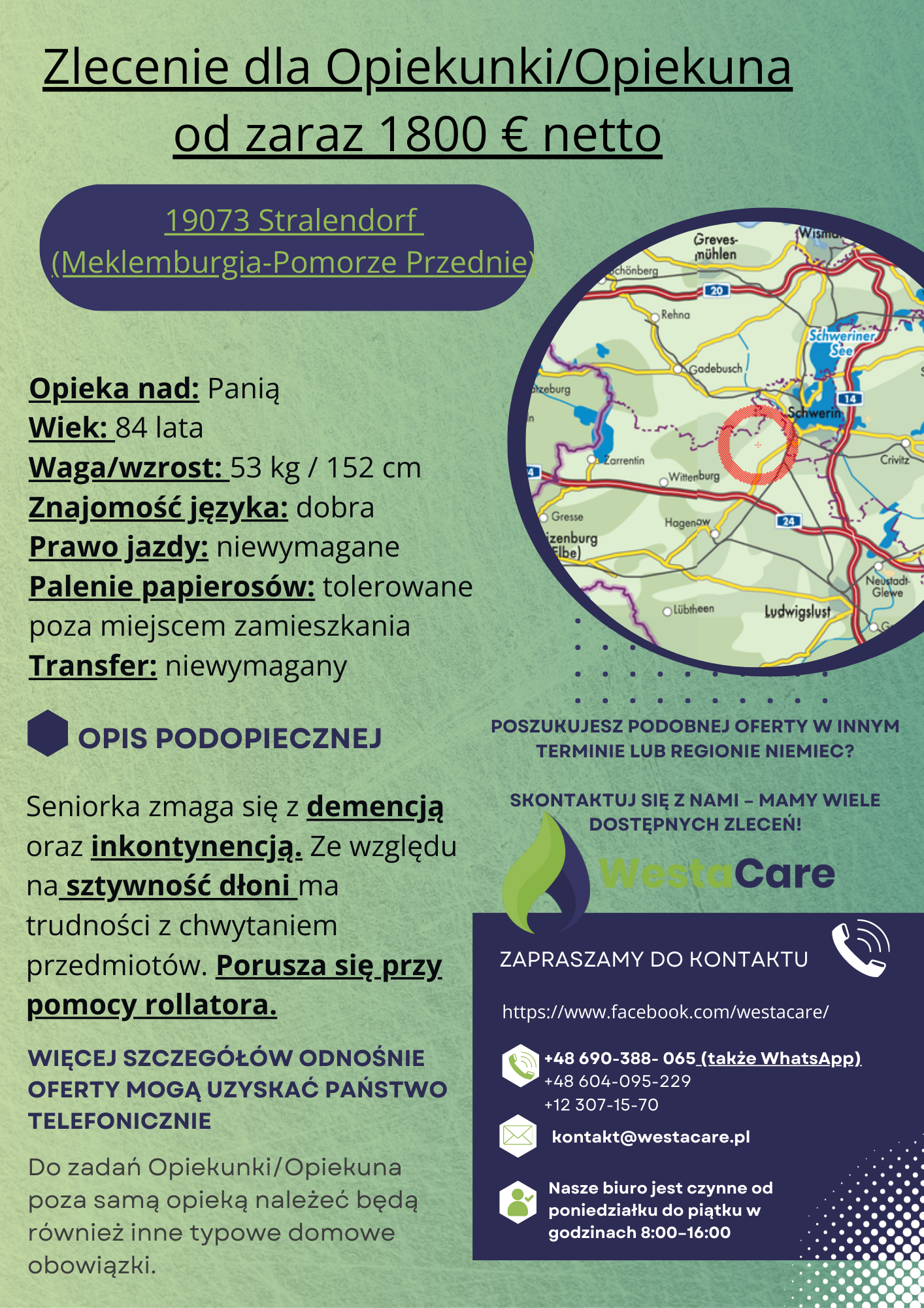 Zlecenie dla Opiekunki/Opiekuna od zaraz 1800 € netto