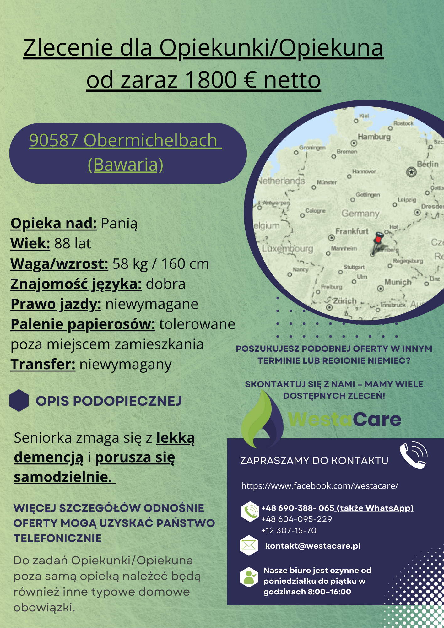 Zlecenie dla Opiekunki/Opiekuna od zaraz 1800 € netto