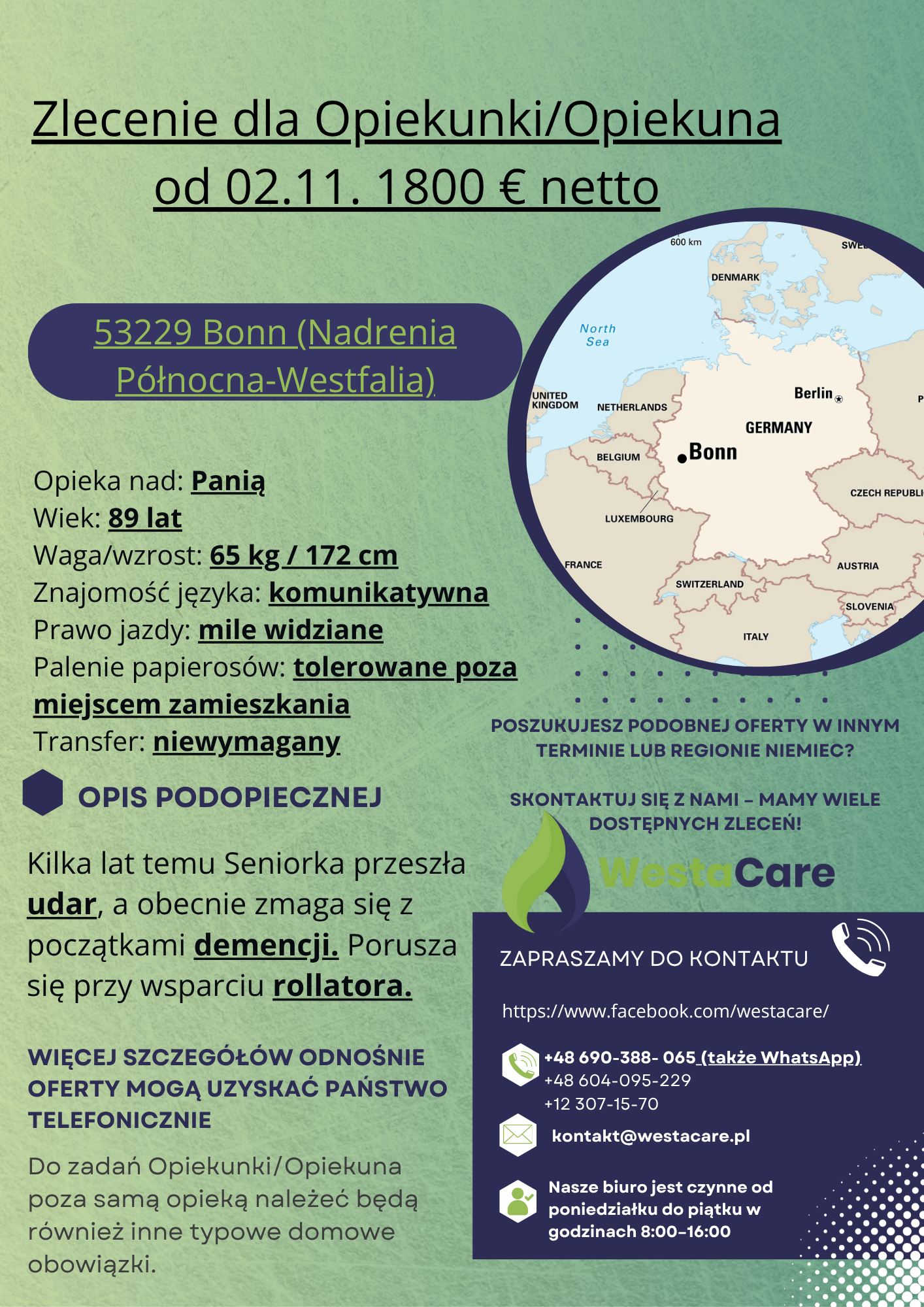 Zlecenie dla Opiekunki/Opiekuna od 02.11. 1800 € netto